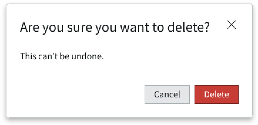 Additionally, you can use a modal to verify a user’s action. This modal appears when a user takes an action or makes a choice that is typically irreversible. The modal helps prevent any damages if the user made the choice by mistake. Use confirmation modals only for user-initiated actions that are irreversible or have a big impact on their workflow.