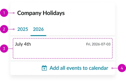 - HR portal: Showing company holidays, benefits enrollment deadlines, and well-being event schedules.
