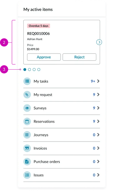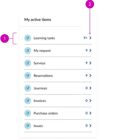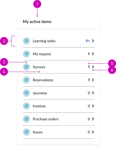 - Title: A clear and descriptive heading indicating the widget's content (e.g., "My requests," "My tasks," "My approvals"). The default title is "My active items." Consider providing customization options for this title.