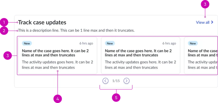 - Pagination (conditional): Visual indicators (e.g., dots, arrows) displayed when the number of cases exceeds the visible area in the carousel, allowing users to navigate through the different sets of cards.