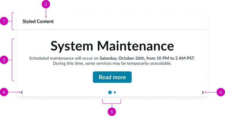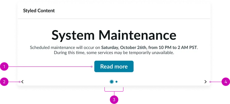 - Pagination dots: Indicators showing the current rich content slide's position within the sequence and allowing direct navigation to other slides. The active dot should be visually distinct.