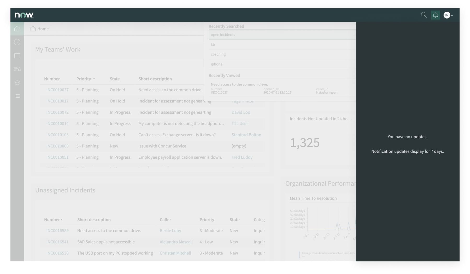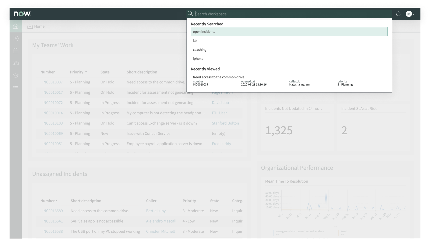 - After the first character is entered, the search popver will display any recently searched terms or recently viewed records (up to 5 each).