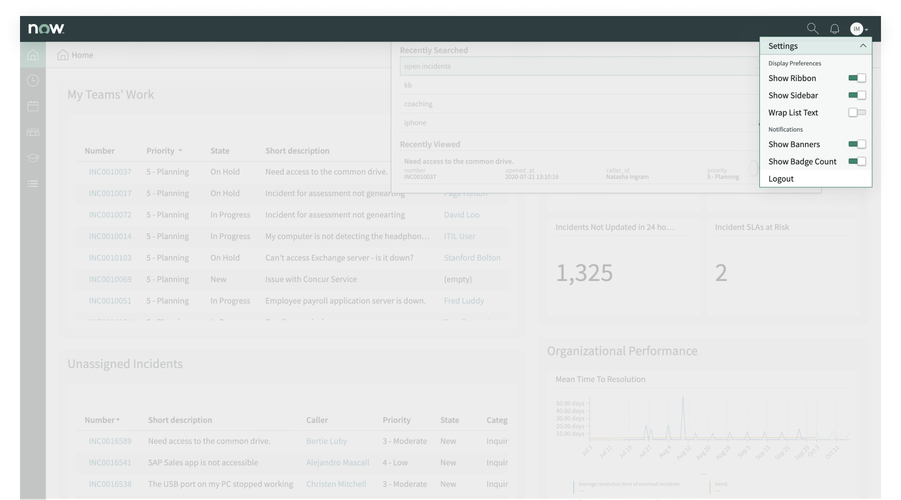 The user menu provides access to a user’s display preference, notification preferences, and the option to log out.