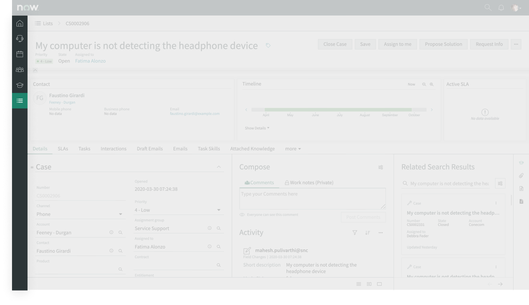- Global search results include Cases, Customers or Users, Now Community Questions, Incidents, Change Requests, Problems, and Knowledge Articles.