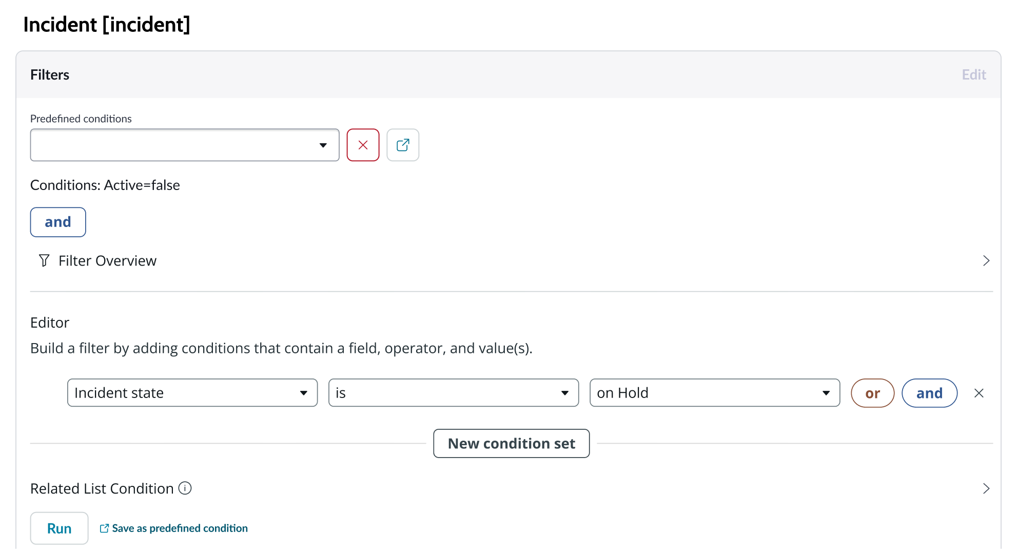 A condition builder above the list enables you to set filter conditions on the data before using it in your visualization. This is useful for limiting the data shown in the chart to only the data you need.