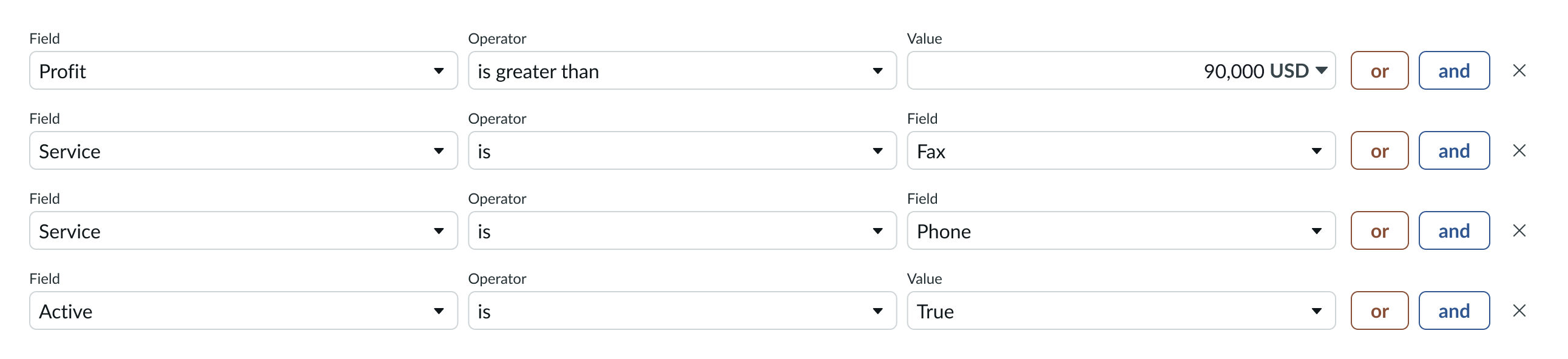 - Condition: Adds a condition with either an or or and relationship to all other conditions
