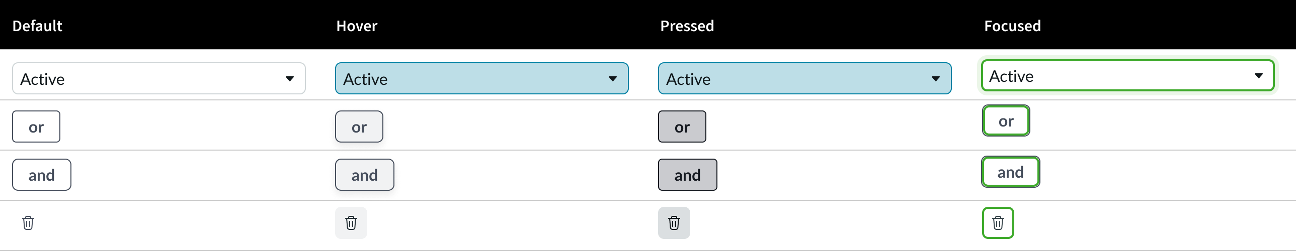 Condition builder has 4 states: default, hover, pressed, and focused.