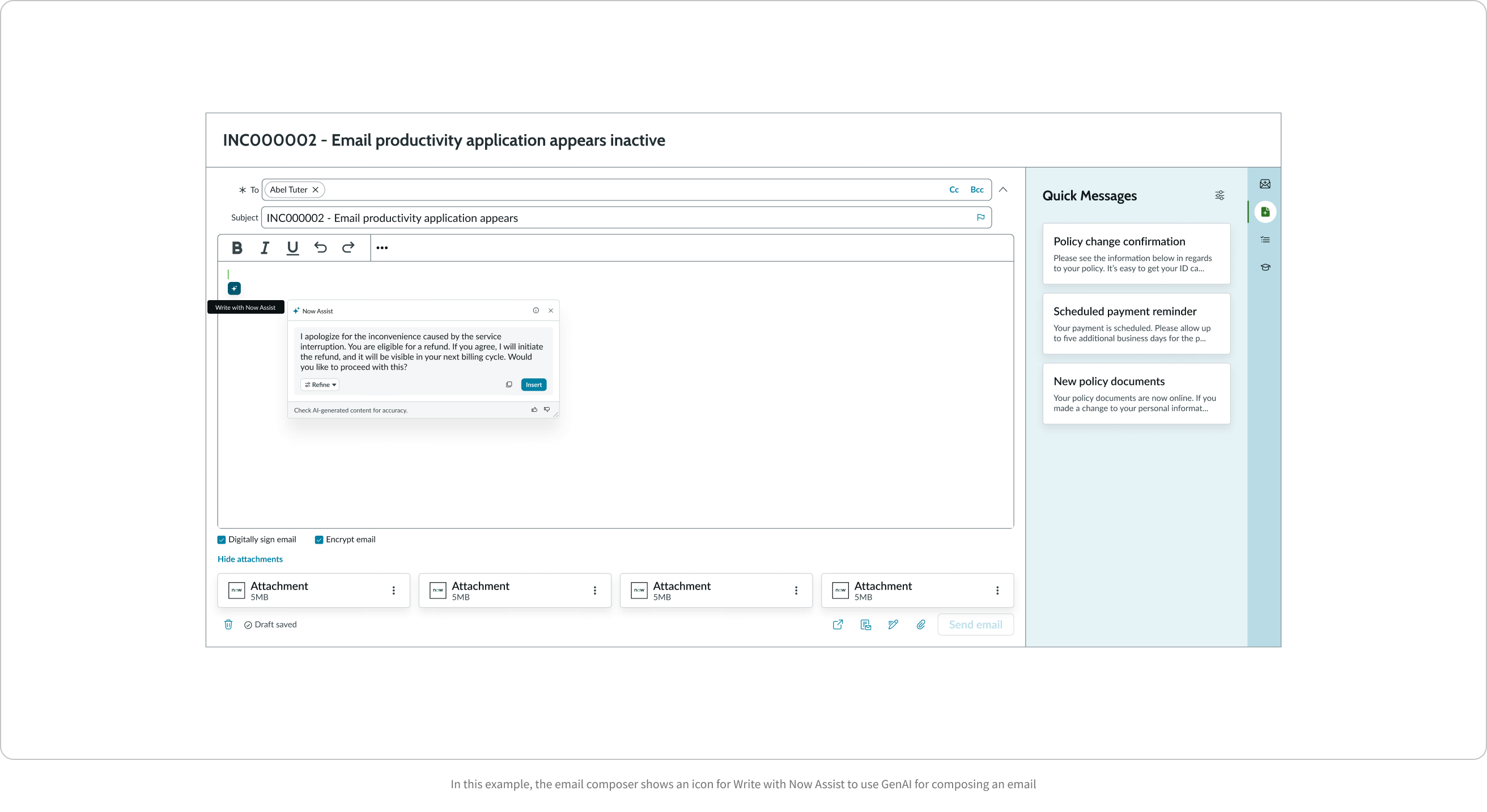 Use Now Assist’s Gen AI capability to select templates, compose a new email, or compose an email response. To use AI for email content, start writing the email and select the Now Assist icon to generate the email content.