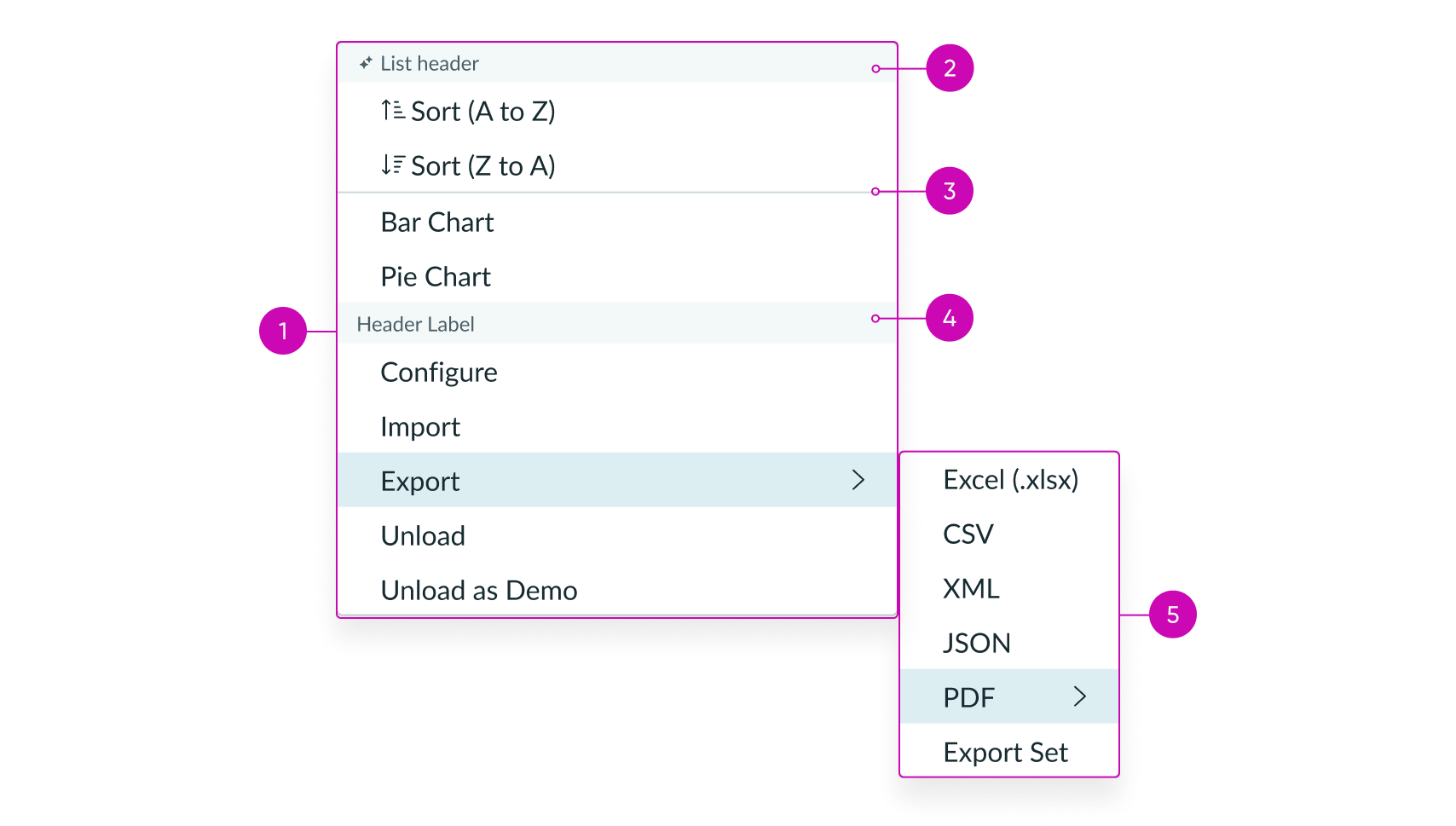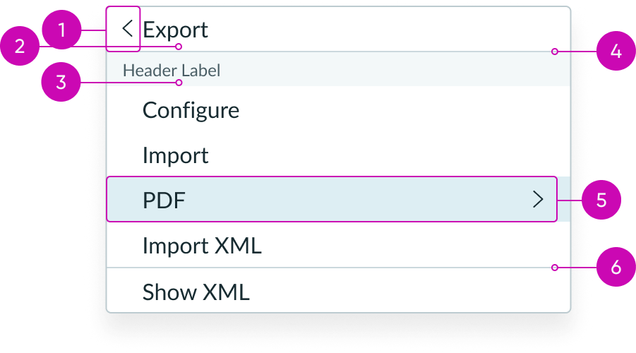 - Header (optional): Visually groups categories of options or actions; if a header or headers are used, then all options or actions should be placed in a header group