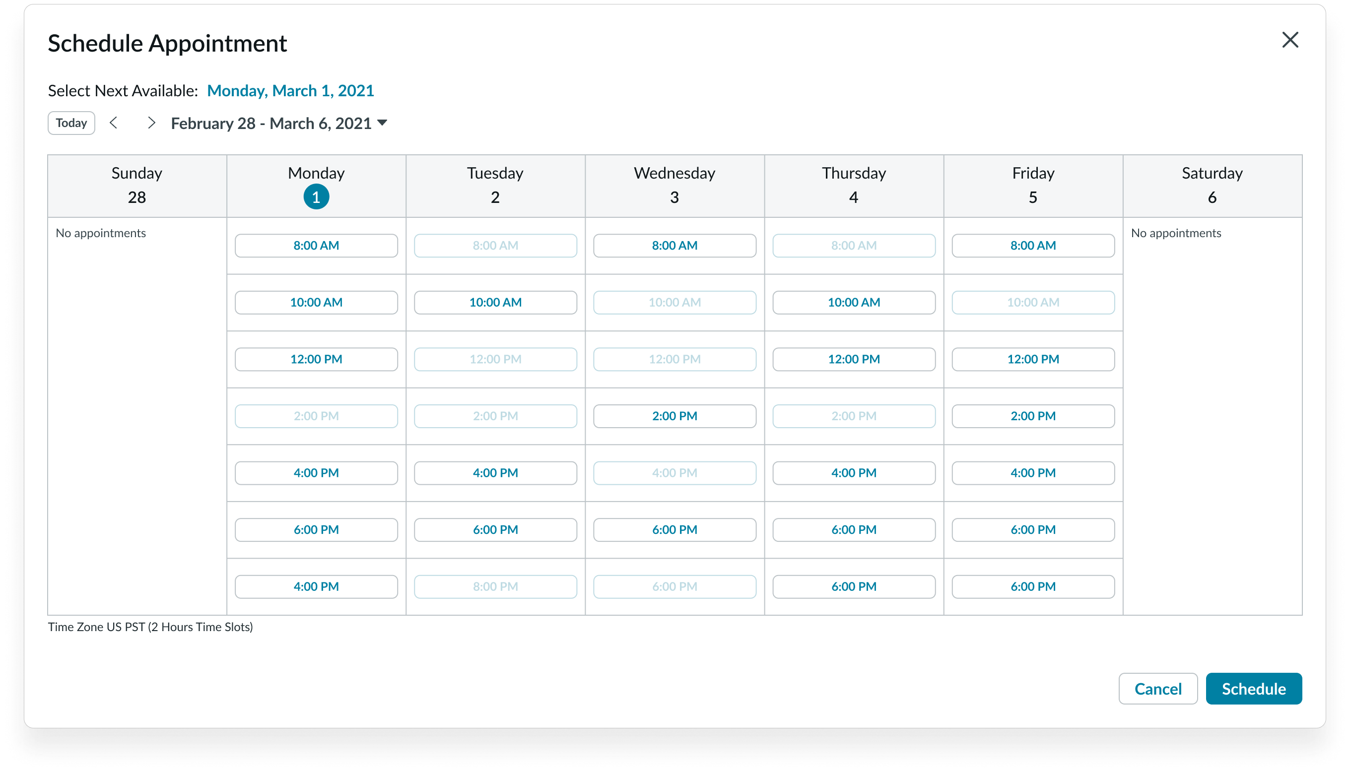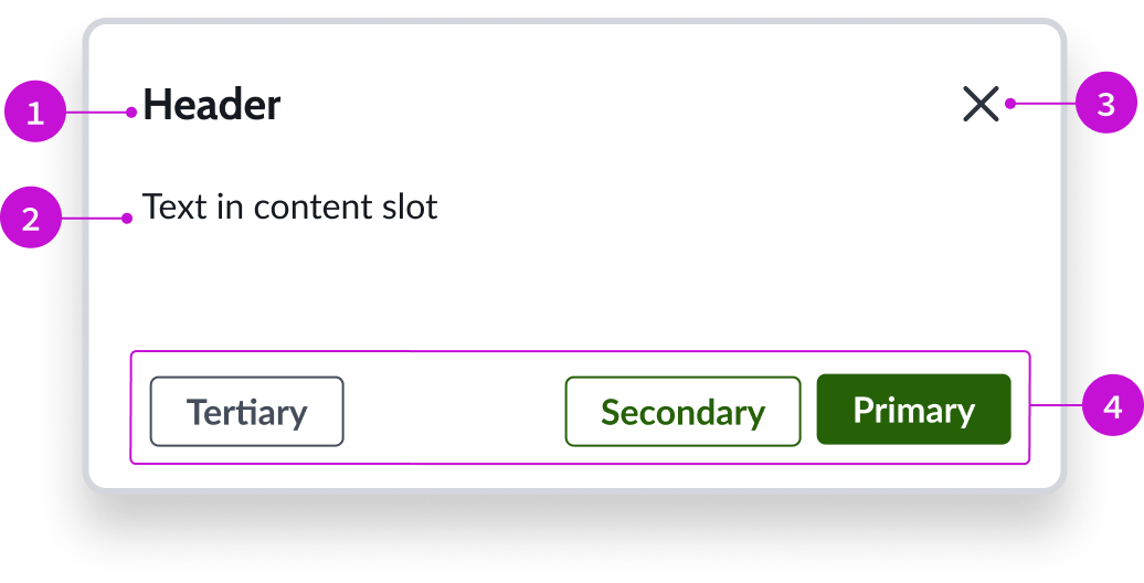 - Content slot: Container for the main content of the modal; the content can be text, forms, lists, cards, or other elements