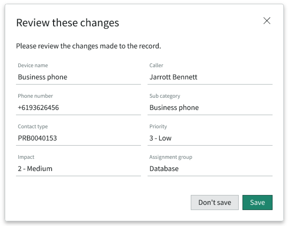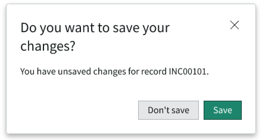 In this example, the modal confirms that the user is about to leave a record form without saving their changes
