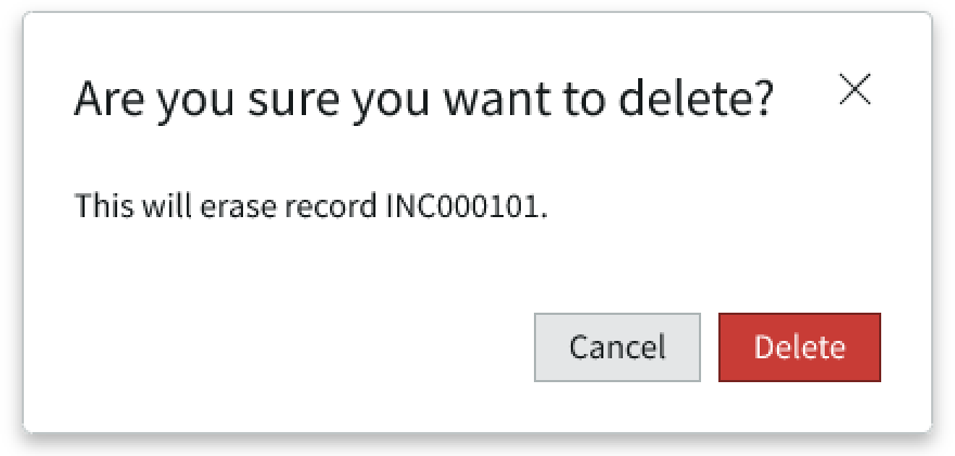In this example, the modal confirms that the user wants to delete the record, a negative action that the user can't undo.