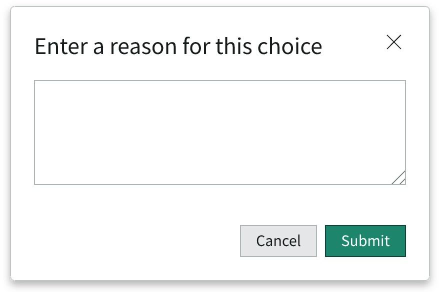 A version of the input modal may ask the user for an explanation behind the chosen action. For this version, an alternative header can be "Enter a reason for this choice" or "Share your feedback on [object]."