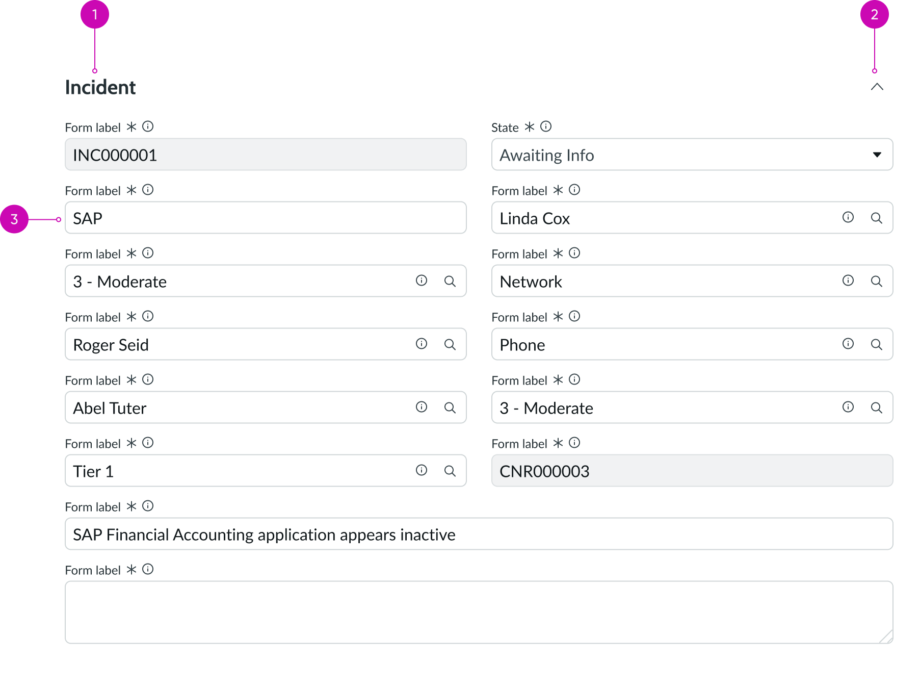 - Disclosure control (optional): Shows and hides the form fields in that section