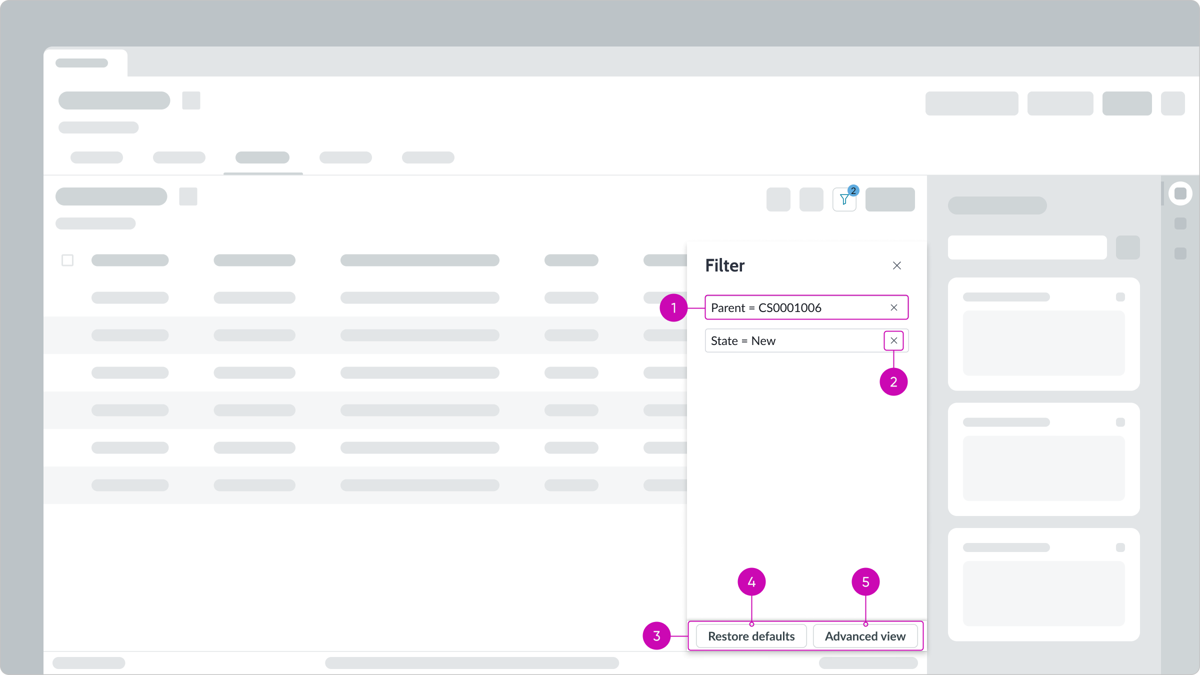 - Filter conditions: Conditions set for the filter in the advanced view