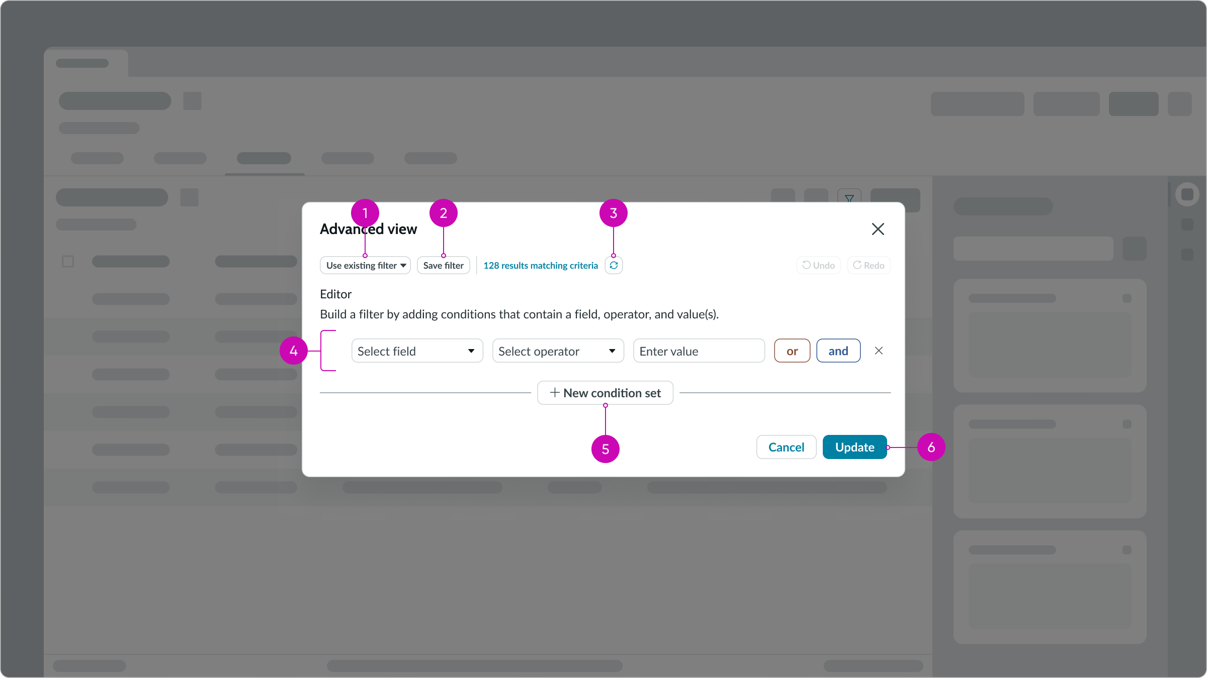 - Advanced view button: Accesses the condition builder, enabling users to create filters