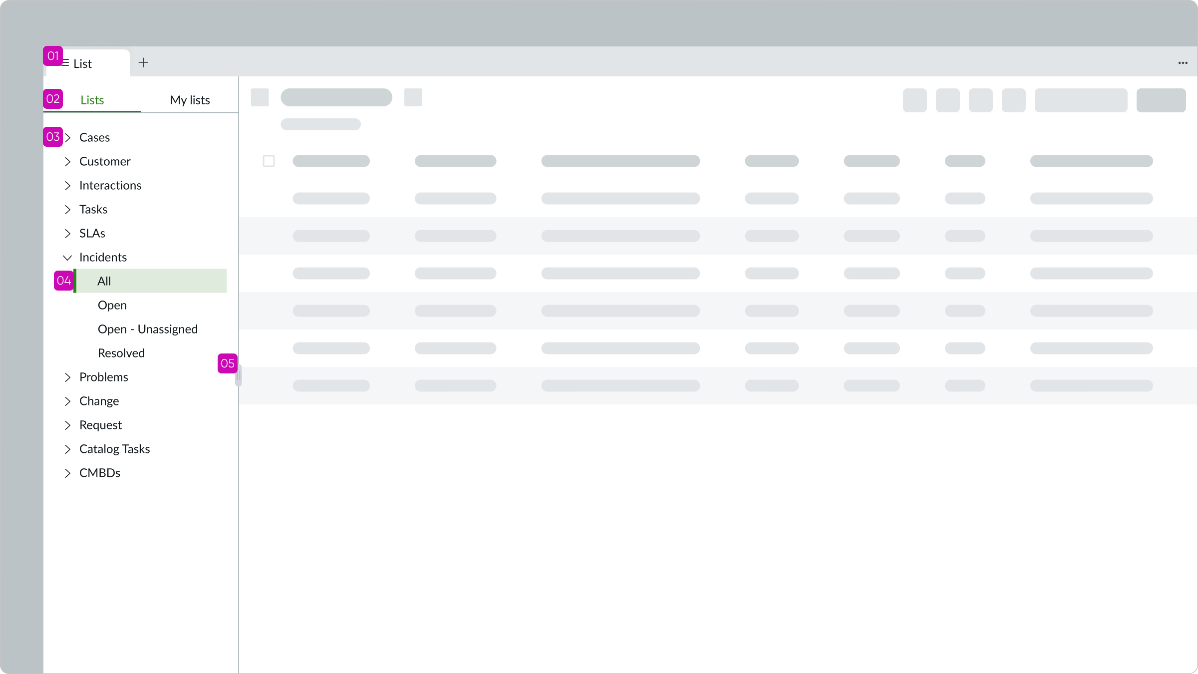 Learn about the individual parts of list menu. List menu presents either a list preconfigured by an administrator or a user's customized list.