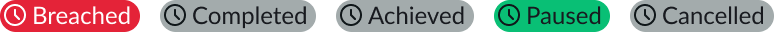 Different colors and labels indicate the SLA’s current stage, from most critical to least critical. There are 5 possible stages: Breached, Cancelled, Paused, Achieved, and Completed. The timer for SLAs that have breached is shown in red. Paused SLAs or SLAs that are still running are shown in green. SLAs that have been resolved or cancelled are highlighted in gray. These stages are taken from the task.