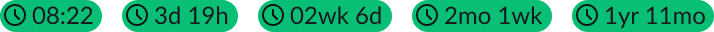 - Icon: Visual element that supplements a highlighted value to indicate a status or category (1yr 11mo, 2mo 1wk, 2wk 6d, 3d 19h)
