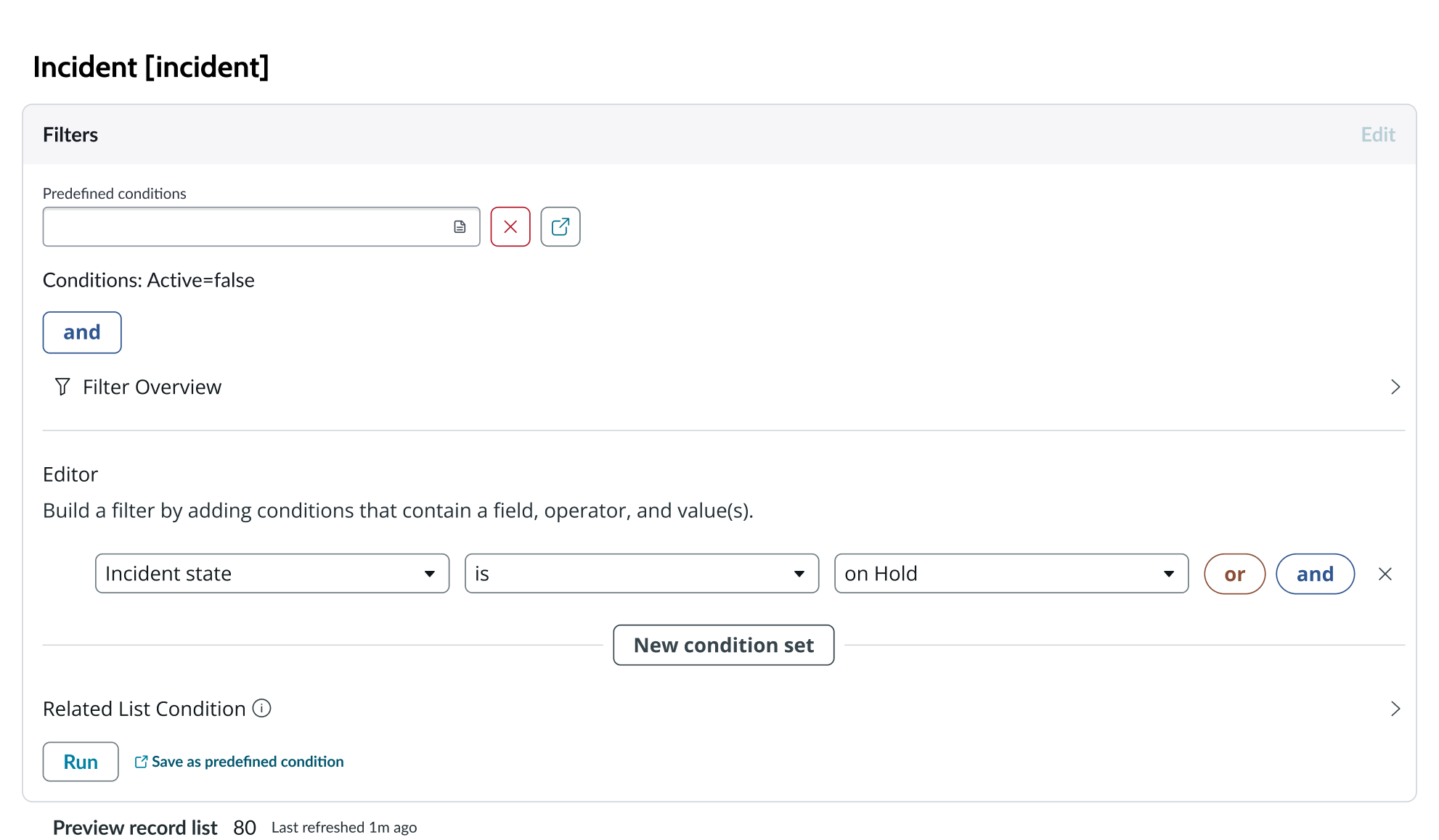 A condition builder above the list enables you to set filter conditions on the data before using it in your visualization. This is useful for limiting the data shown in the chart to only the data you need.