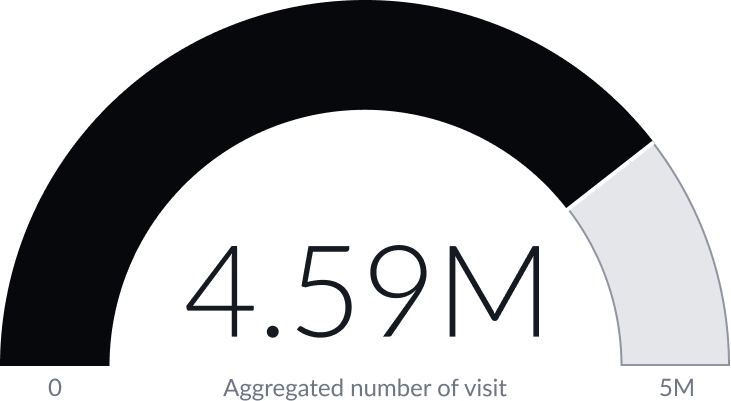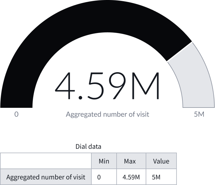 Use a dial chart to display how a singular, linear range of progress information changes. The user can quickly view the progression to a numerical or percentage maximum value. Dial chart is usually used in executive dashboards to represent key indicators related to any domain such as, academics, healthcare, analysis, and human resources.