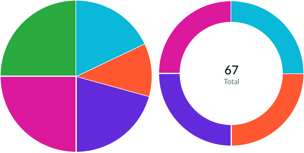 The difference between a pie chart and donut chart is the way you display the data. All slices within a pie chart are solid, whereas the donut chart features an empty space in the center for data.