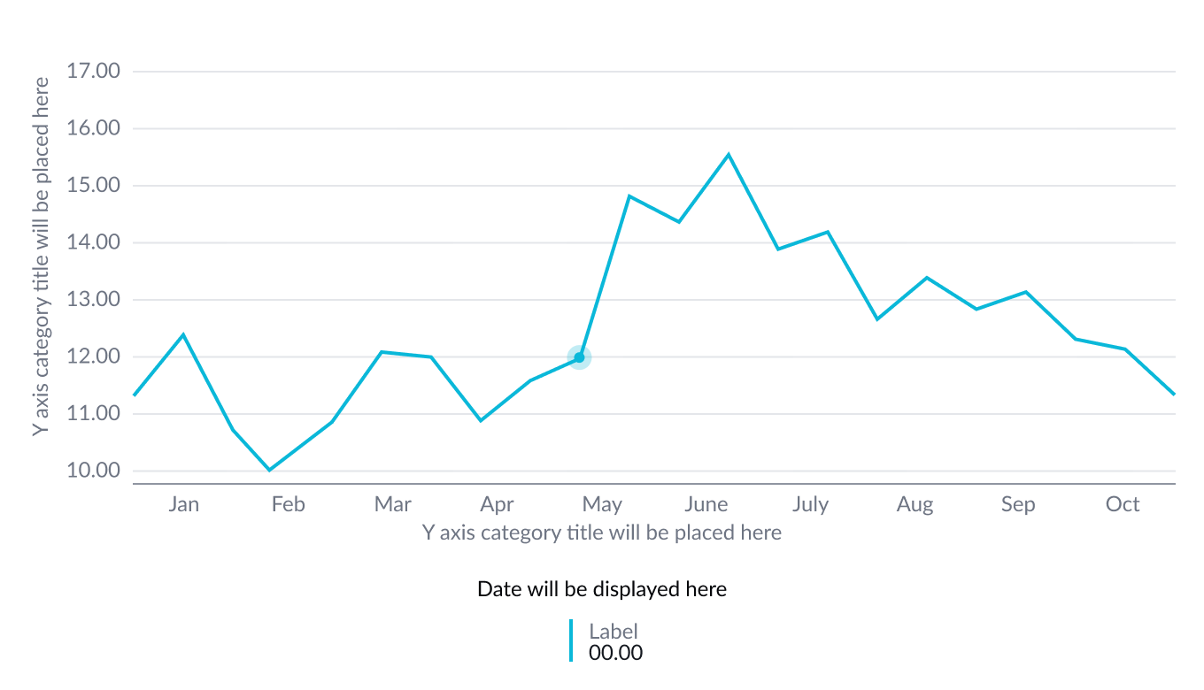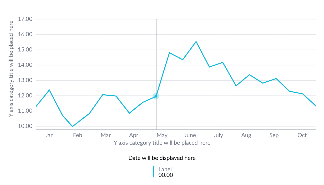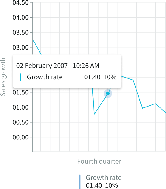 When a user hovers over a data point in a line or area chart, both the grid lines and the data point are highlighted, and the register displays the data point’s value. The hover state shows a vertical line that visually connects the y-axis with x-axis and highlights the data point in the timeline. The data point shows a marker with a halo around it. If you have enabled the tooltip, it displays when the user’s cursor touches the data point’s threshold.