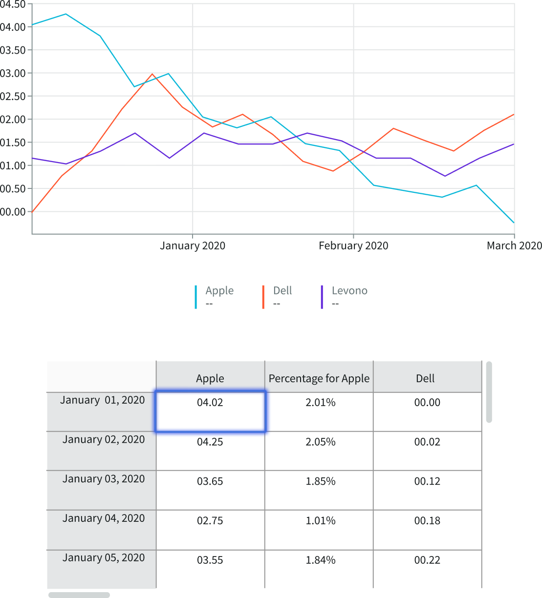 This example shows the time series data table. The screen reader reads the entries as the user manually navigates the table using the arrow keys.