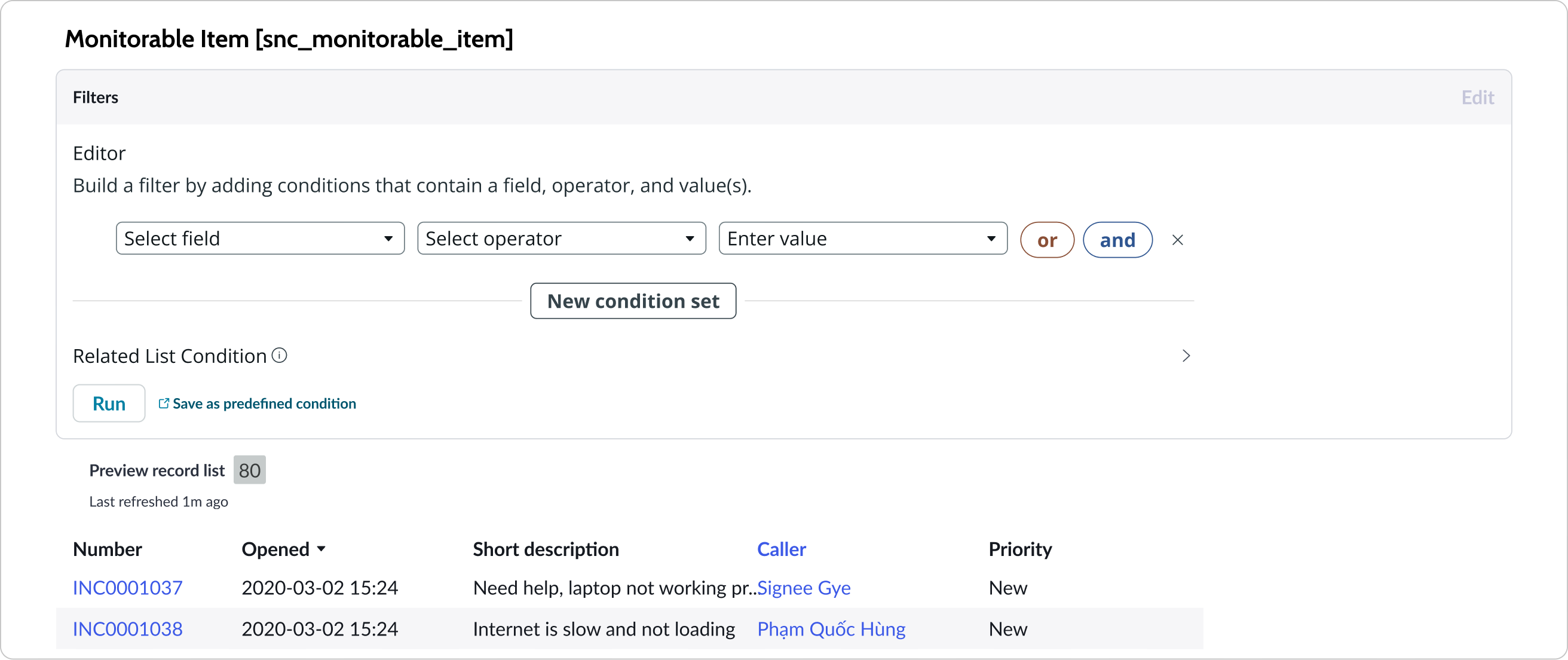 A condition builder above the list enables you to set filter conditions on the data before using it in your visualization. This is useful for limiting the data shown in the chart to only the data you need.