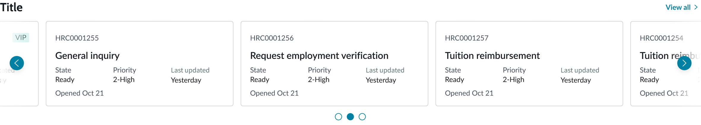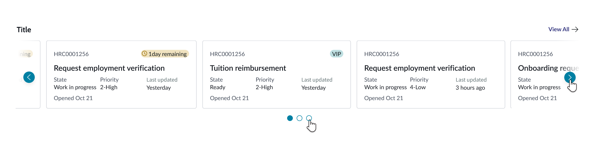 - Dot indicator (optional): Displays the number of available items or item sets in the carousel, with the current item set highlighted; the dots can also be used to navigate within the carousel