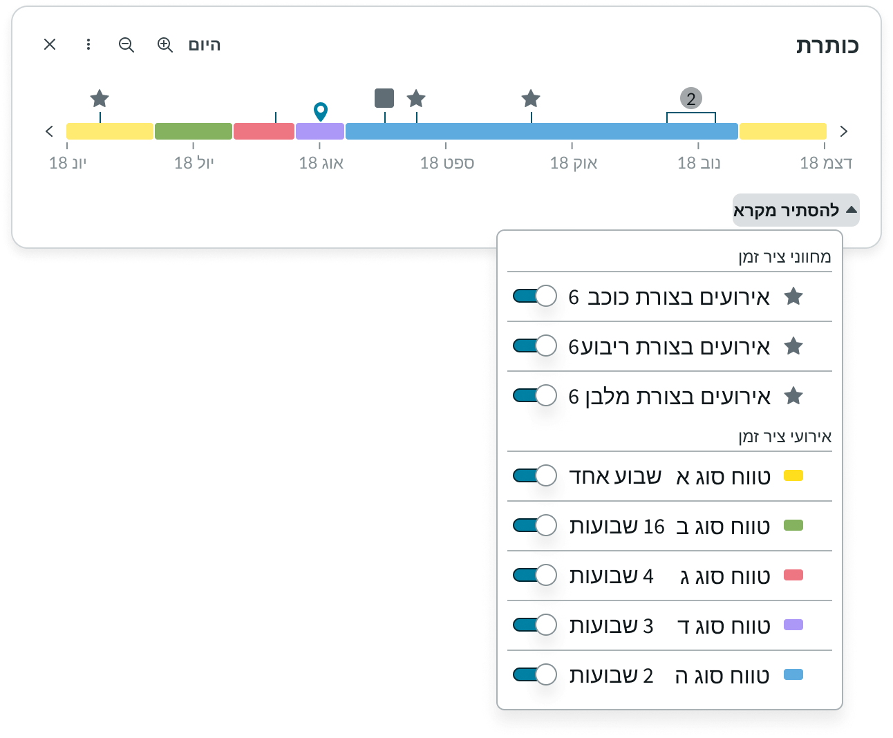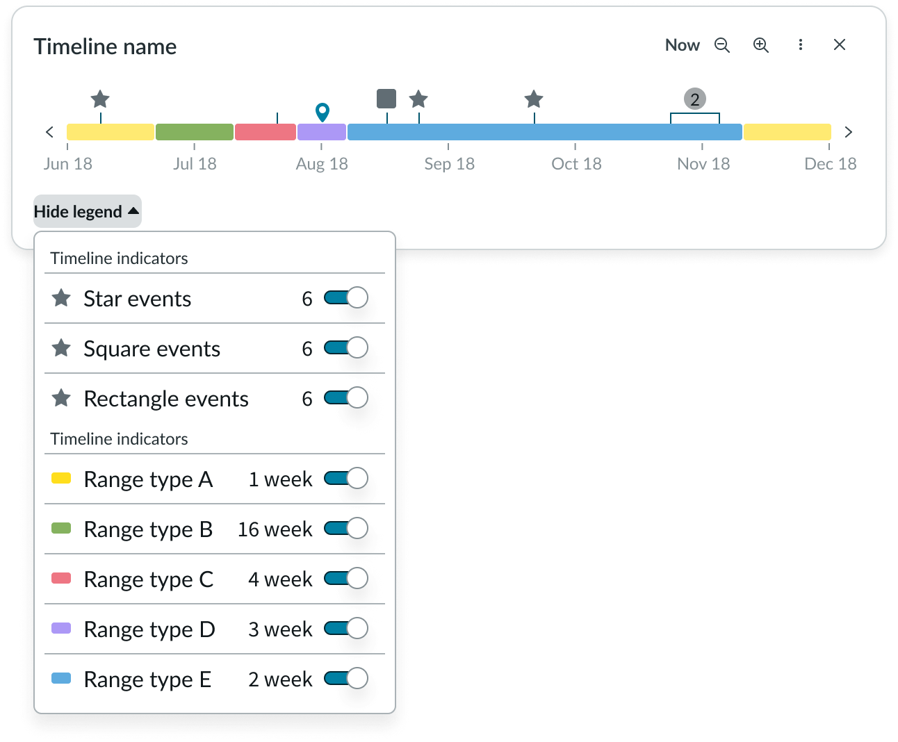 - Event toggle: Toggles the visibility of event indicators or ranges on the timeline