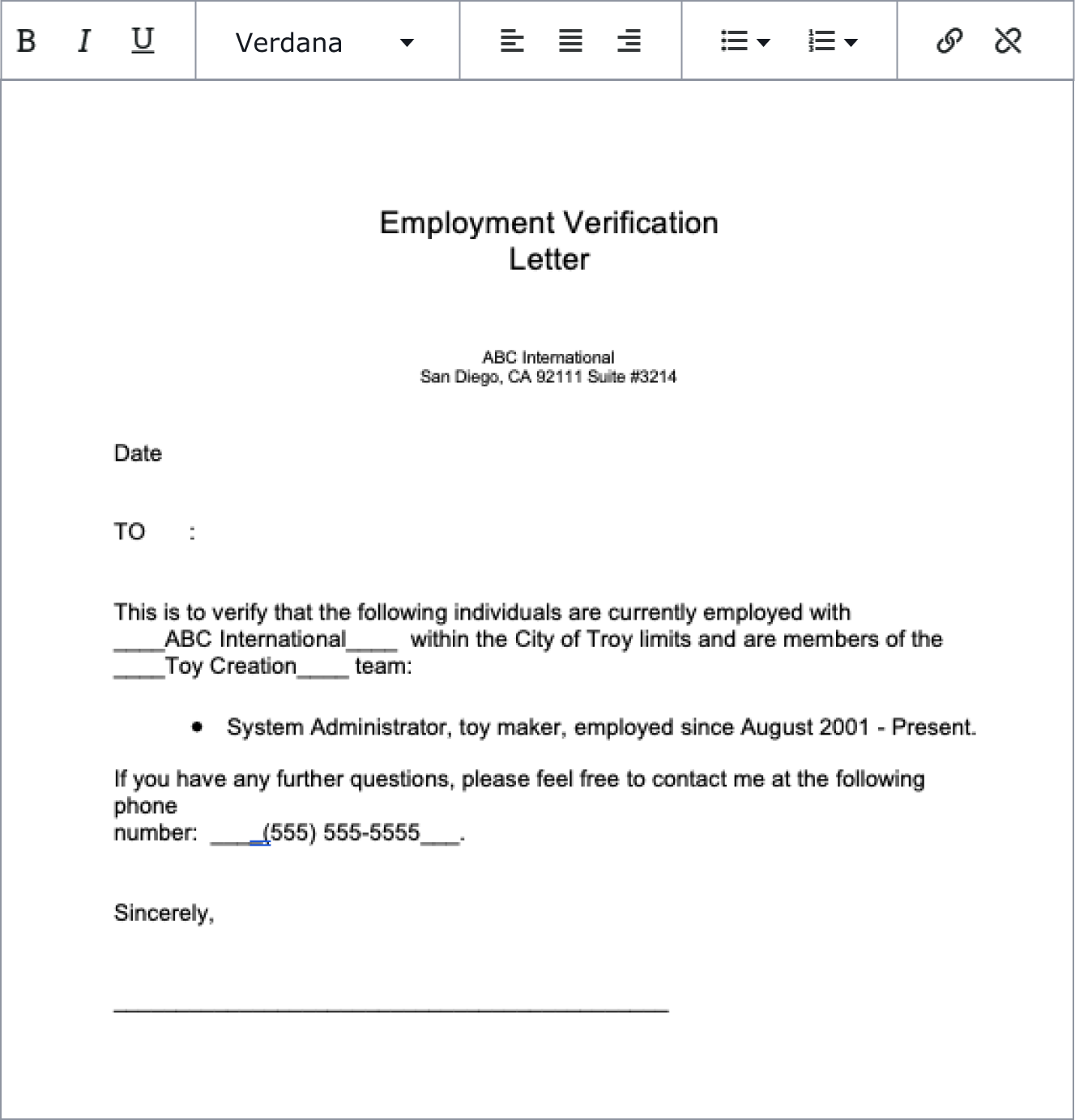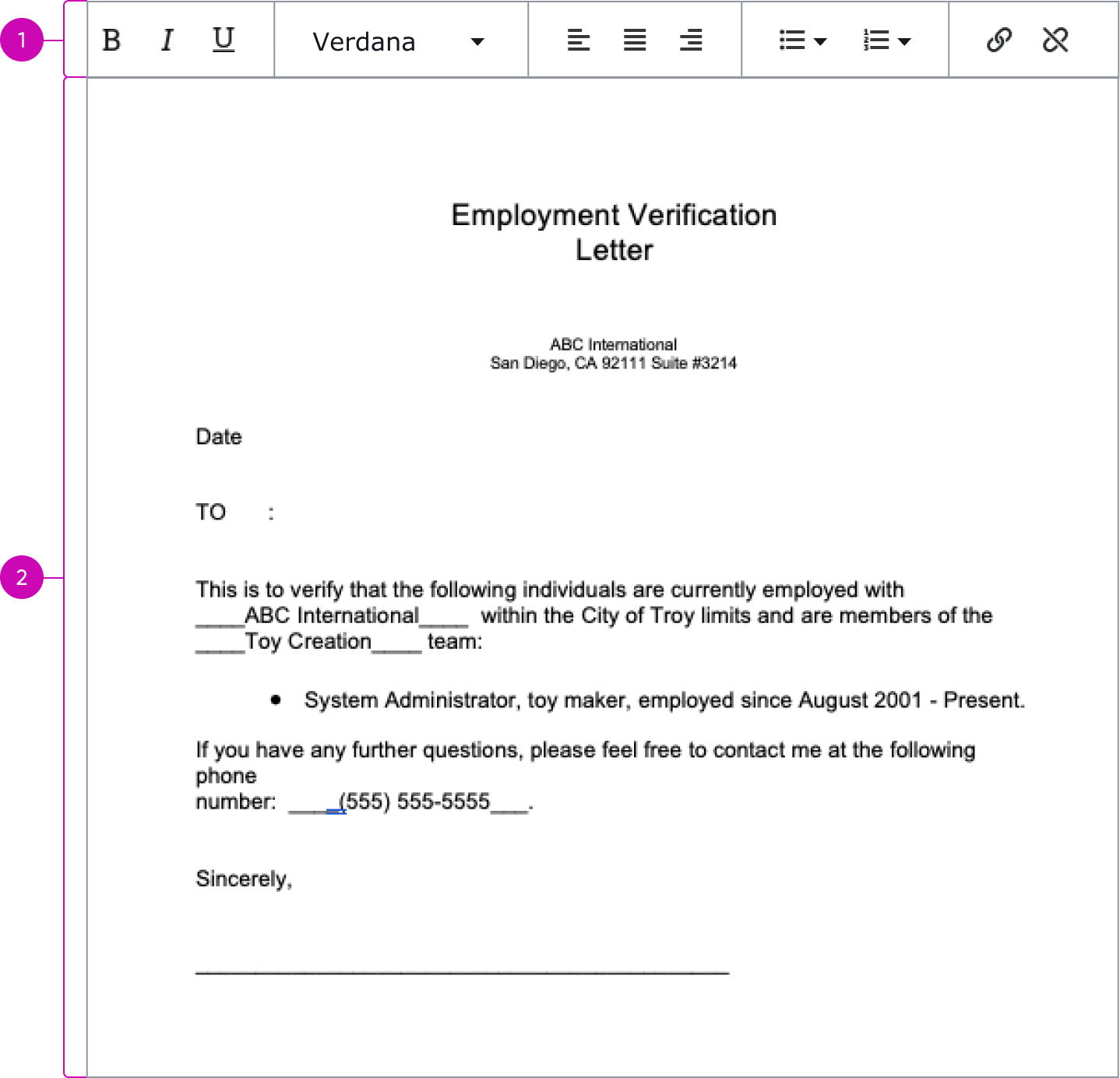 - Rich-text editor bar: Enables document editing controls such as font styles, orientations, bullet lists, and external linking