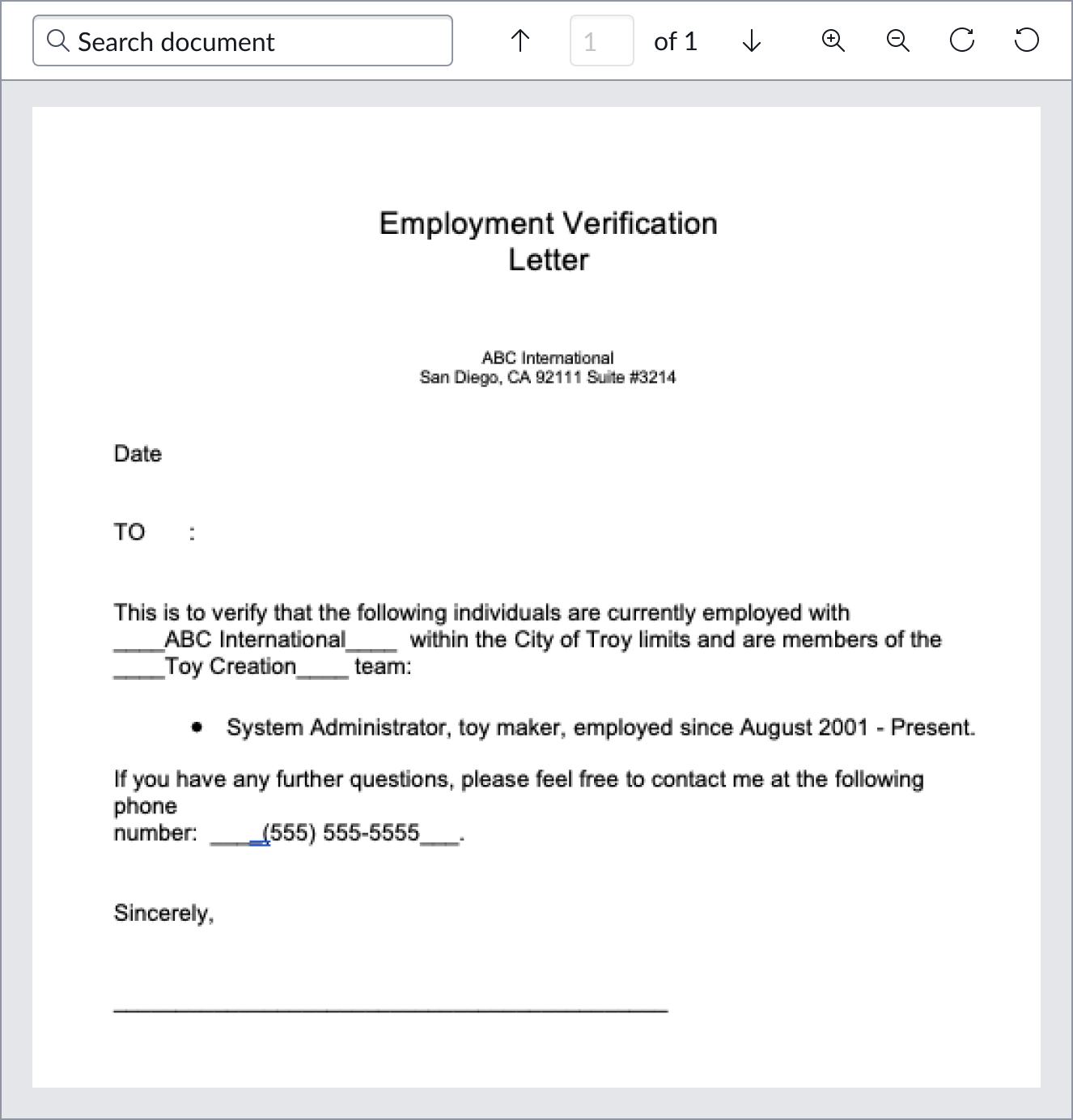 The attachment view can be used to display a PDF document or an image. If this view is selected, the user will have access to search, download, and rotate controls in the action bar.