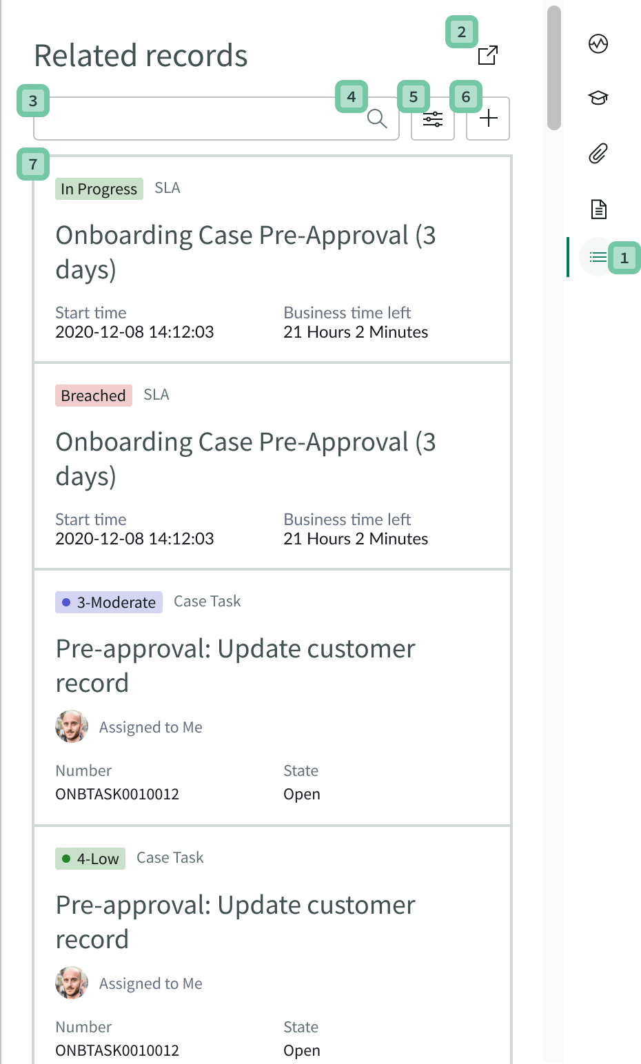 The related records page template enables agents to access records that are related to content in their main working area, without having to navigate away. Components used in the page allow the agent to add records, search for records, and filter the list. The cards in the list provide at-a-glance information about each related record or email. Details include task priority, SLA status, and contact information.