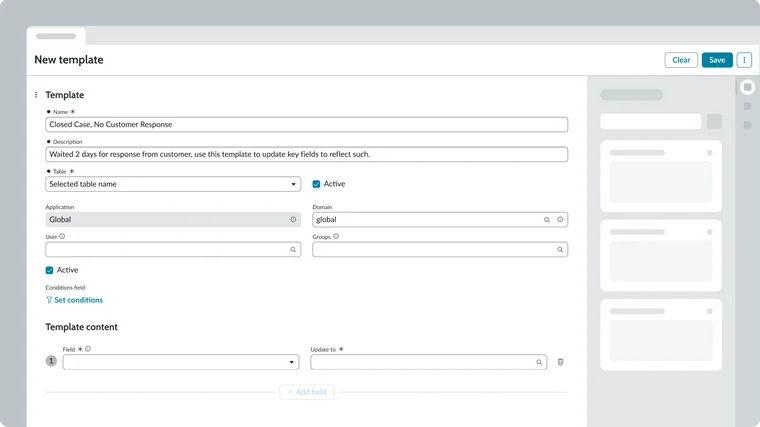The Template page represents a form used specifically for creating or managing templates that define the structure and content of new records. These forms include specialized fields, such as those for defining variables and conditions, which control how the template will apply its values to a record. This pattern is optimized for configuration and repeatable setup, allowing users to standardize complex record-creation processes across the platform.