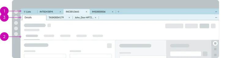 - Child tabs – subtabs that appear within a record tab when opening related records or tools (for example, opening a related record in an existing session might open as a child tab under that session). By default, the first child tab (often “Details” of the record) is fixed and cannot be closed.