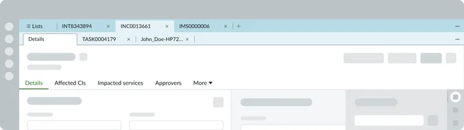 “Record tabs” refers to the pattern of splitting a record’s information into multiple contextual tabs. For example, an Incident record page might show the main form in one tab (“Details”), and related information (like “Activity Stream”, “Attachments”, or related lists of child records) in additional tabs. Use record tabs when a single record contains a lot of information or sub-sections – it keeps the interface cleaner and allows users to navigate record details vs. activities without scrolling excessively. It’s essentially a specialized use of the Tabs component for record context.